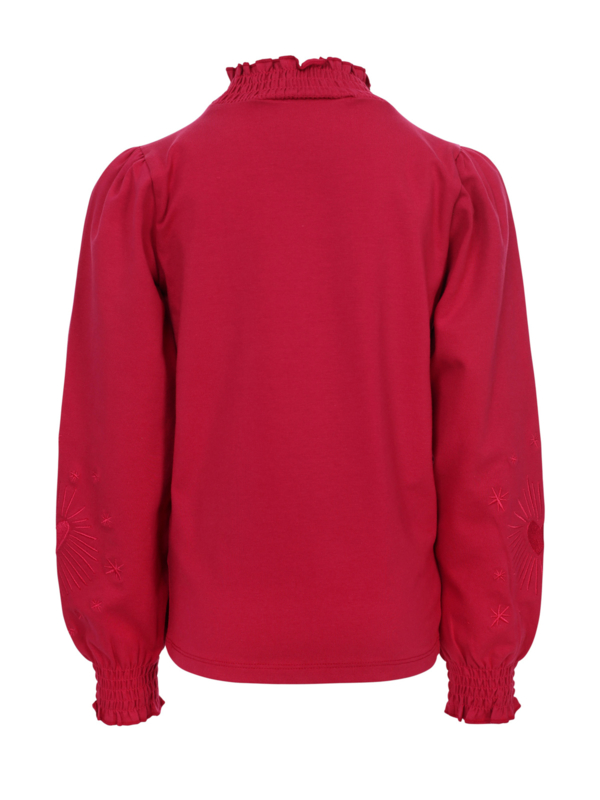 Tricot shirt met een wijde pofmouw en onderaan de mouw een borduursel. In een fris kleurtje roze met aan de bovenkant een opstaande boord elastiek.