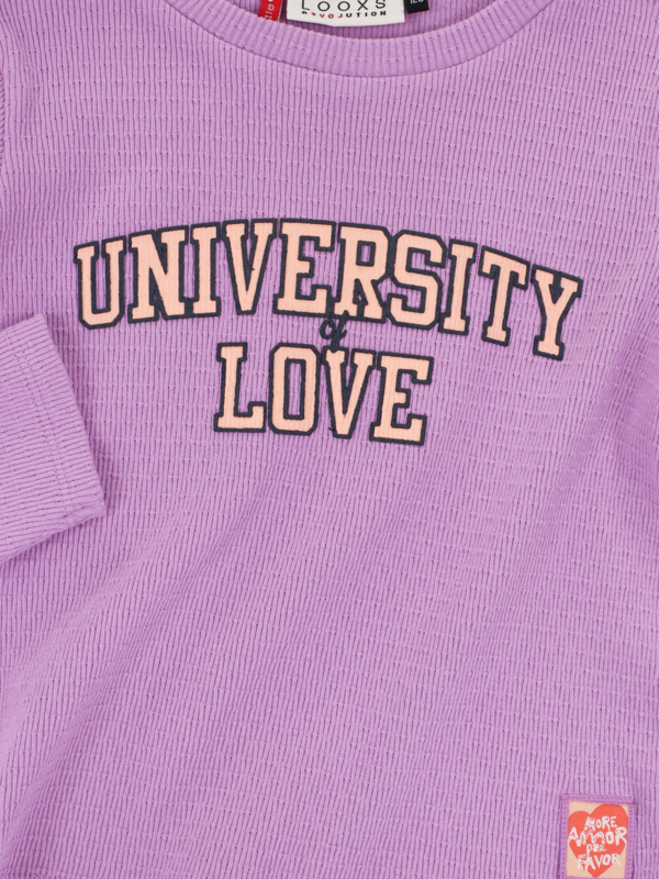 Aangesloten shirt in fijn breisel met een werkje erin geweven. Met op de voorkant tekst in een fris lila kleurtje.