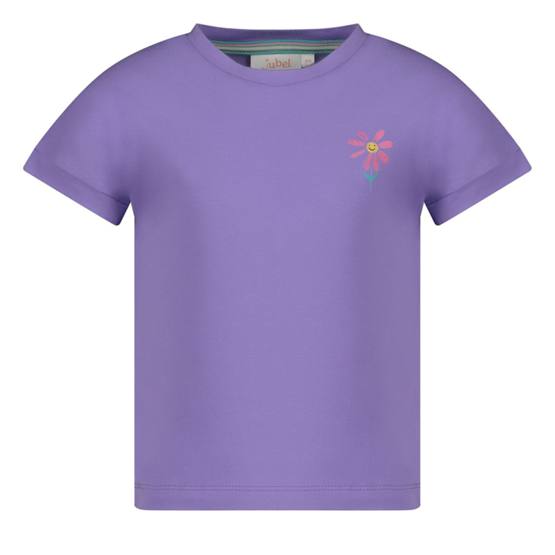 Ruimvallend shirt met op de achterkant een print in een fris kleurtje paars. Is ook leuk om te combineren met een bijpassend kort broekje.