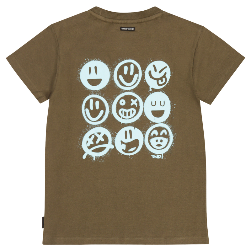 Ruimvallend olijfgroen shirt in een fijne tricot. Met op de achterkant een aqua blauwe print.