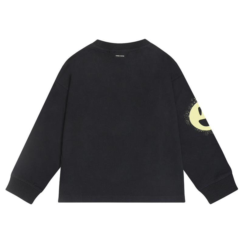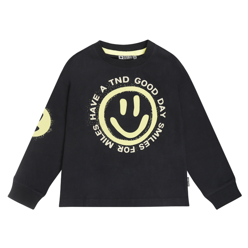 Ruimvallend shirt met op de voorkant een gele smiley print.