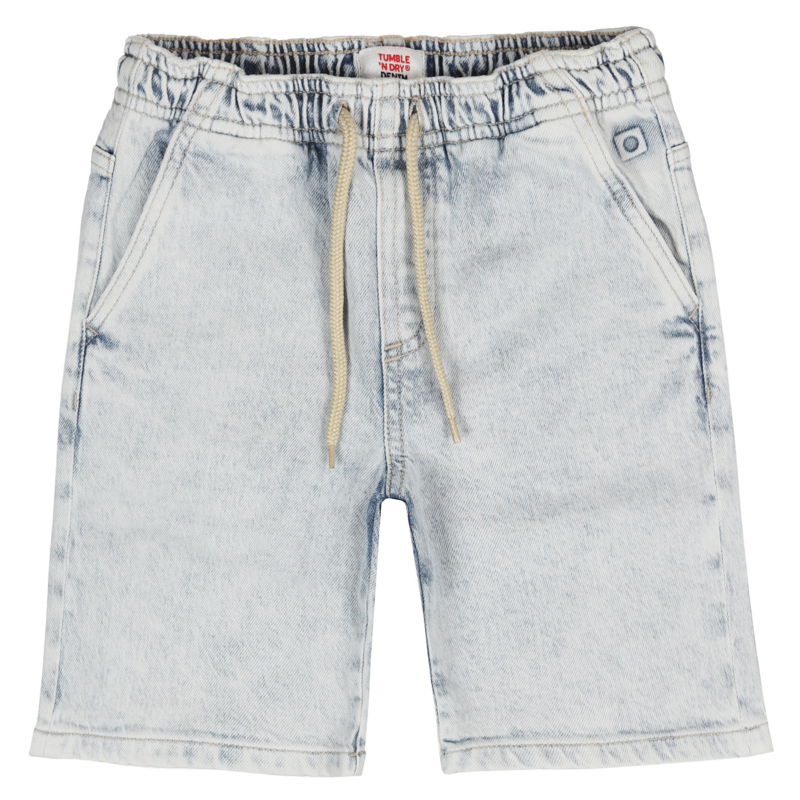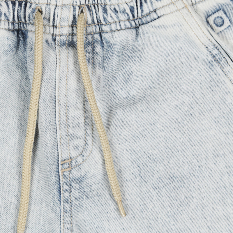 Stoere jeans korte broek in een mooie lichte wassing. Met in de boord een koord om het aan te halen.