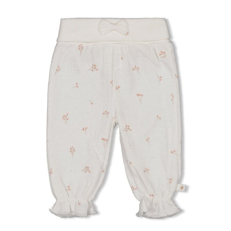 Rekbaar broekje met een klein bloemetje met een omgeslagen boord. Onderaan de pijp zit er elastiek.