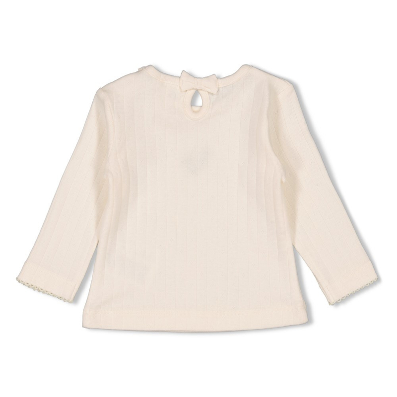 Aangesloten longsleeve in een mooie offwhite kleur en een ingeweven streepje. Een bloemetje op de voorkant geborduurd en op de schouder drukknoopjes.