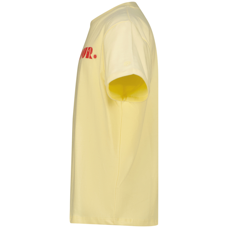 Artikelnummer: 0092mts OverzichtRuimvallend shirt in een zacht geel kleurtje met op de voorkant rode letters. In een fijne zachte tricot.