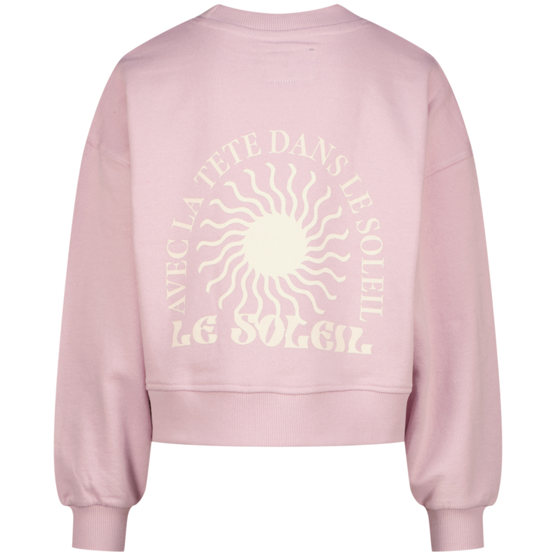 Korte sweater in een zacht kleurtje roze. Met op de achterkant een print. In een fijne tricot en is eventueel te combineren met een bijpassend kort broekje.