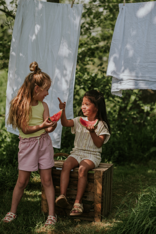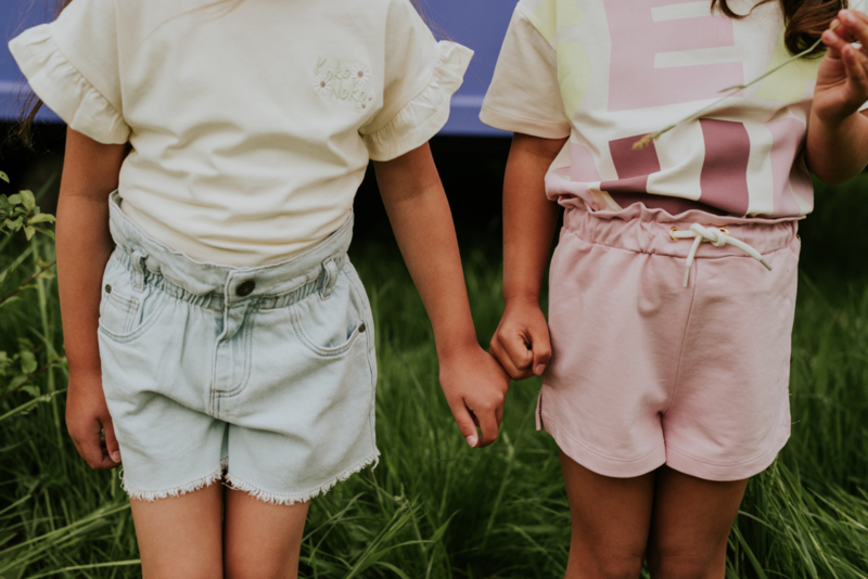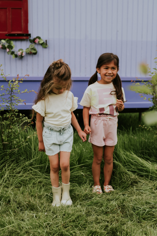 Tricot kort broek in een zacht roze kleurtje met een koord in de boord om het aan te halen.