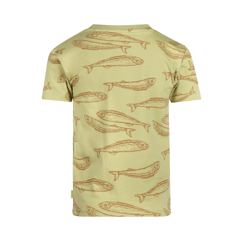 Aangesloten shirt in het frisse groen met bruine vissen. In een fijne tricot en is ook leuk om te combineren met een bijpassende korte broek in hetzelfde groen.
