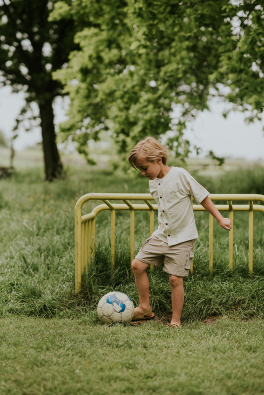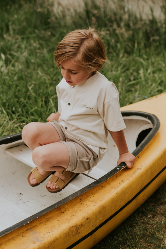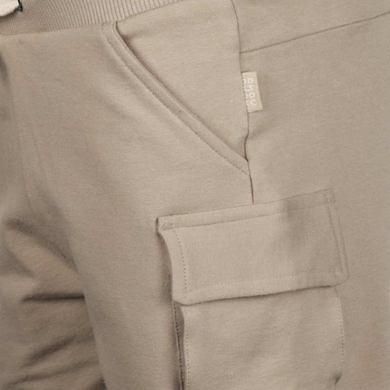 Tricot korte broek met aan de zijkant grote zakken en een koord in de boord om het aan te halen. In een warme zandkleur.