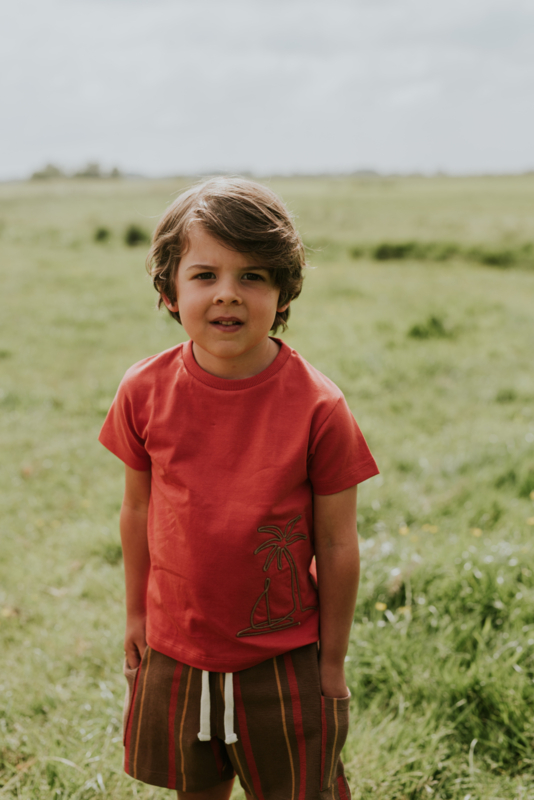 Ruimvallend shirt in een fris kleurtje rood met een donker bruine print. In een fijne tricot en is ook leuk om te combineren met een bijpassende gekleurde korte broek.