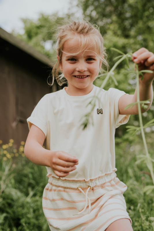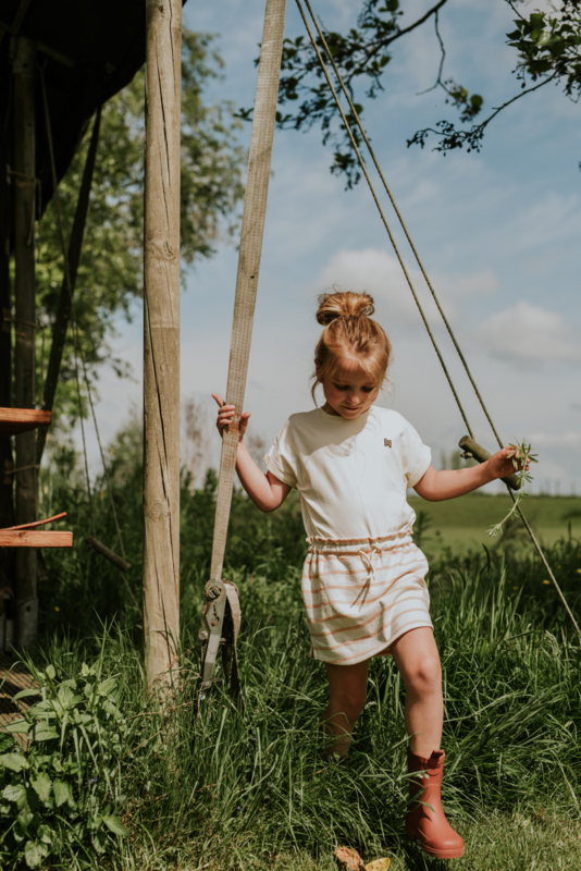 Tricot jurkje waarvan het rok gedeelte van badstof is met een zalm streep. Een koord in de taille om het aan te halen.