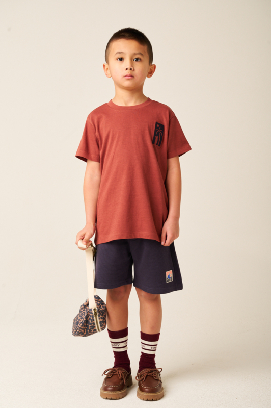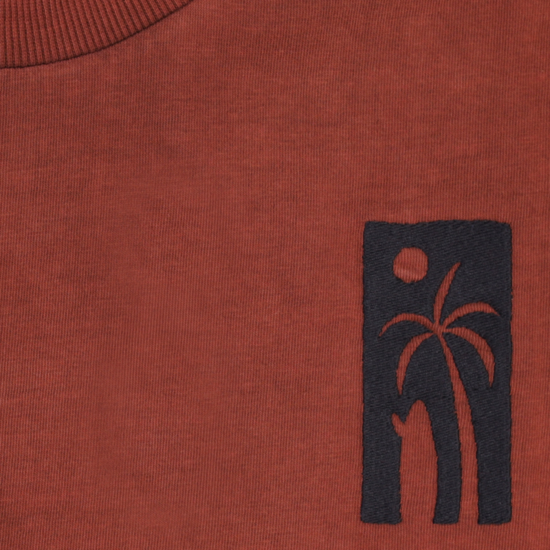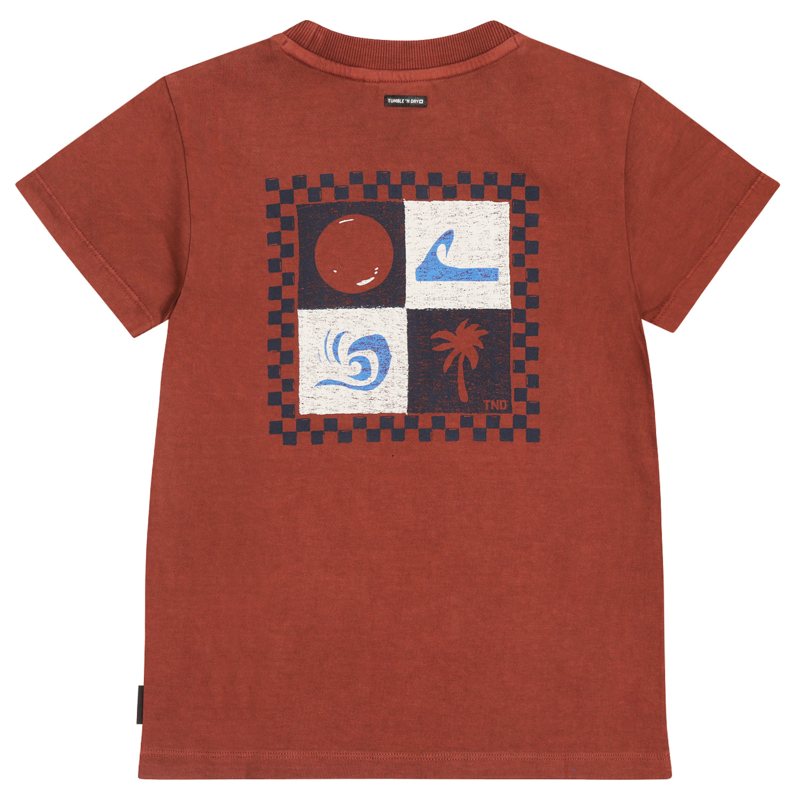 Ruimvallend shirt in een warme brique kleur. In een fijne tricot met op de achterkant een print.
