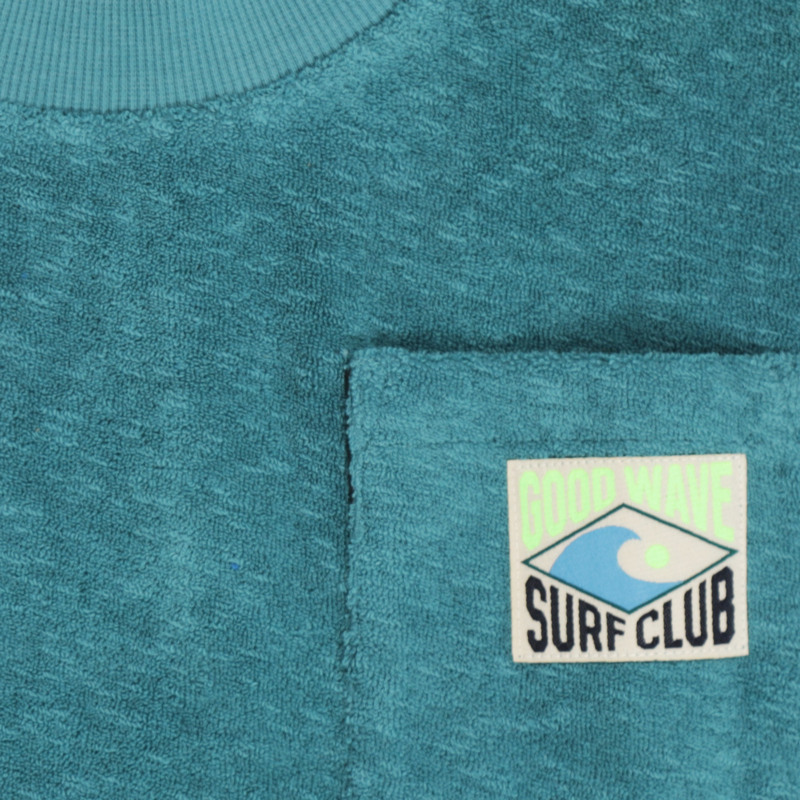 Ruimvallend shirt in een fijne badstof. Is ook erg leuk om het te combineren met een bijpassende korte broek van hetzelfde materiaal. In een fris kleurtje petrol blauw.