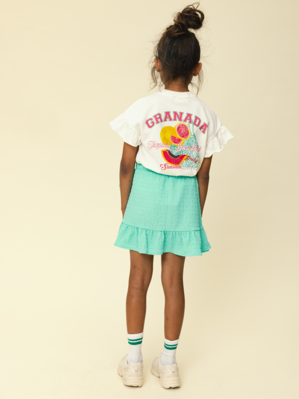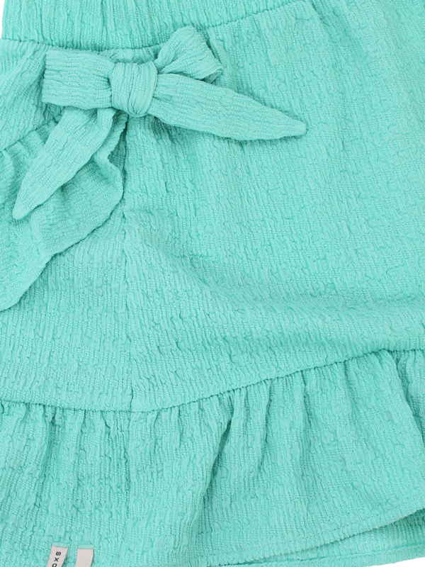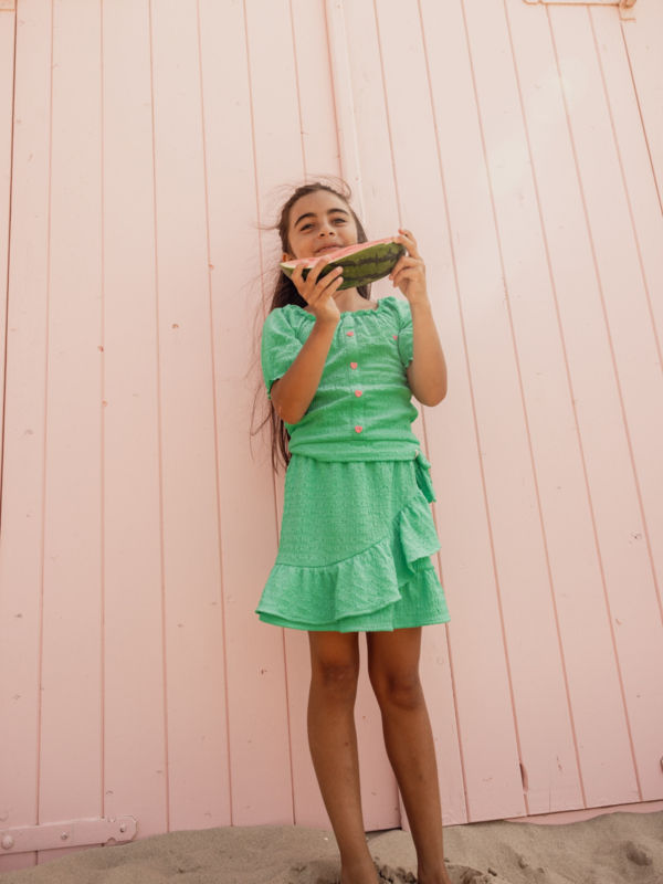 Zwierig zomers rokje in een fris kleurtje mint groen. In een fijne rekbare stof met in de boord elalstiek,