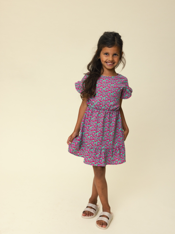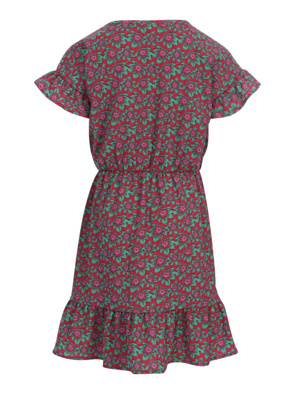 Zwierig zomers jurkje in een fijne rekbare stof. Een bloemenpatroon in frisse kleurtje roze en mint groen. Aan de onderkant en mouw een ruche.