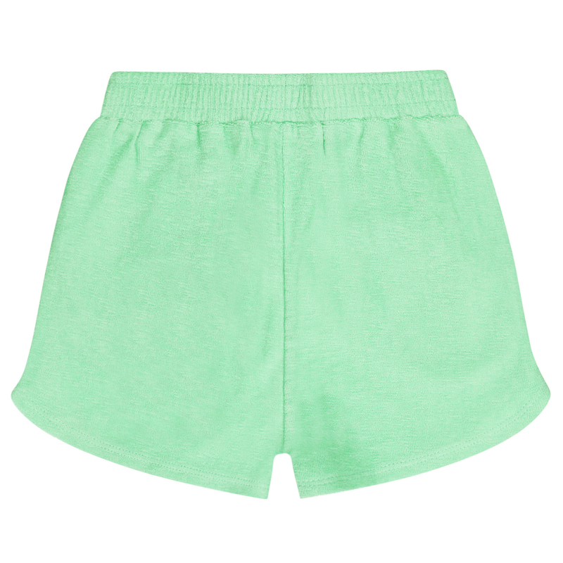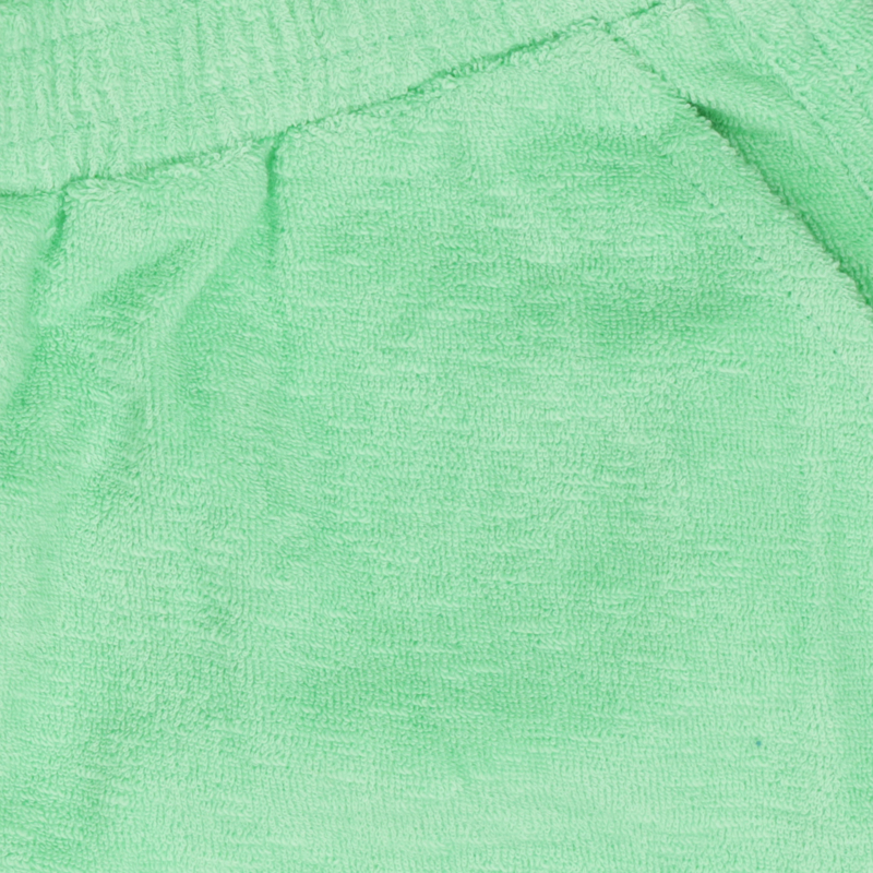 Pittig kort broekje in een fijne badstof. Is ook verkrijgbaar in het roze. De kleur groen komt iets feller groen over dan op de foto.
