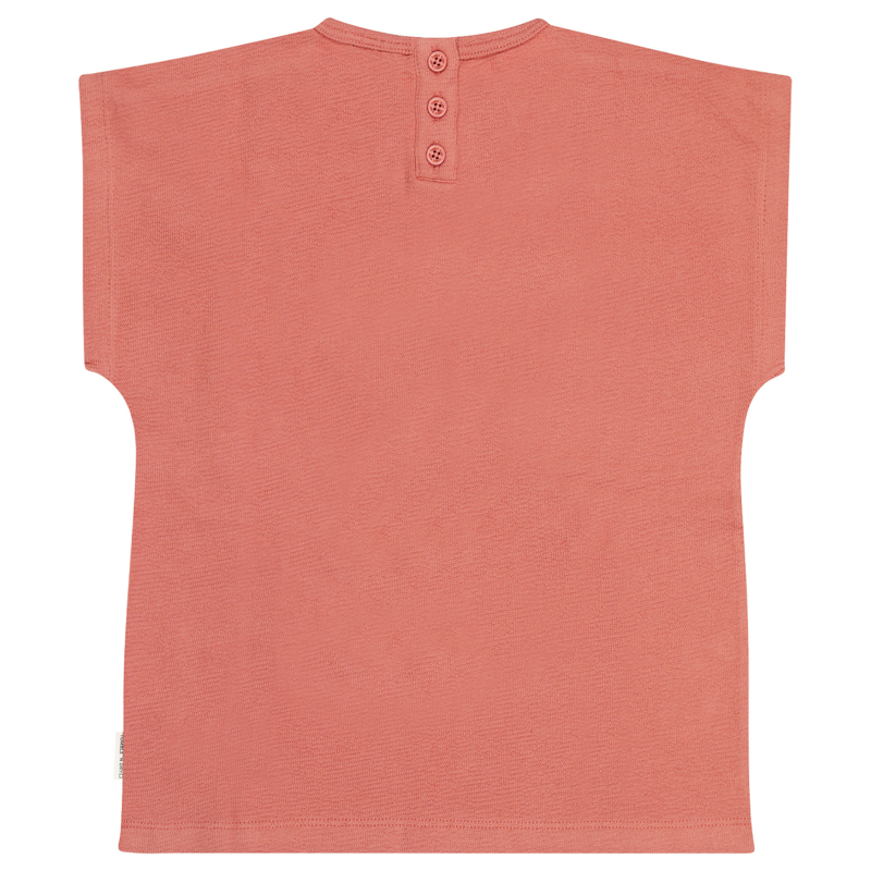 Ruimvallend shirt in een fijn breisel. Het heeft een brique kleur met een gekleurde lila print. En een aangeknipte mouw.