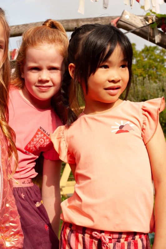 Vrolijk gekleurd shirt met op de achterkant een print. Met een kort ruche mouwtje.