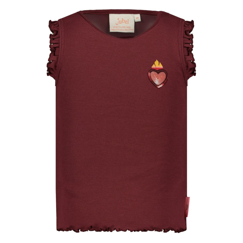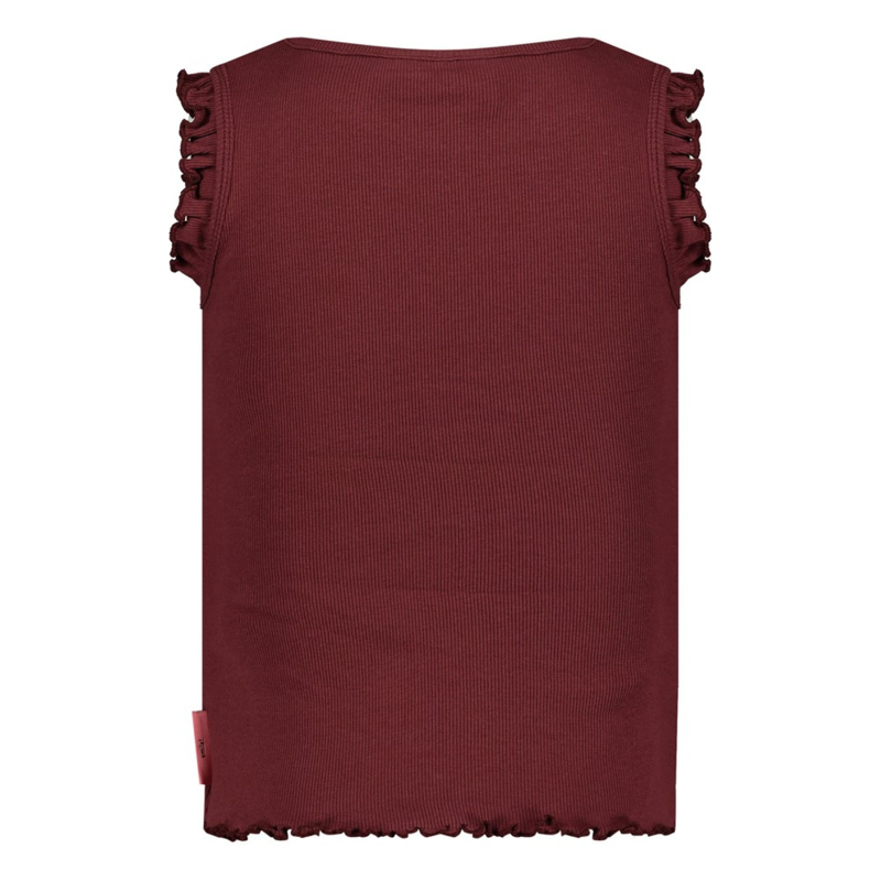 Katoenen top met een ingeweven streepje in een warme kleur donker rood. Met een ruche aan de mouw.