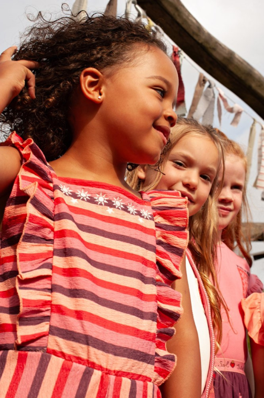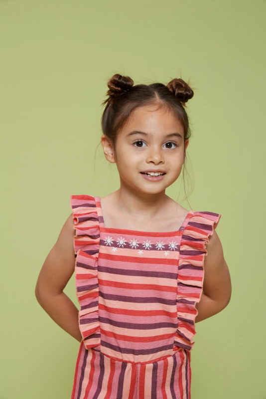 Super mooie jumpsuit in een fijne rekbare stof. Met vrolijk gekleurde streepjes en op de voorkant een borduursel. Op de achterkant een gedeelte met smok en elastiek. Een ruche aan het armsgat gedeelte.