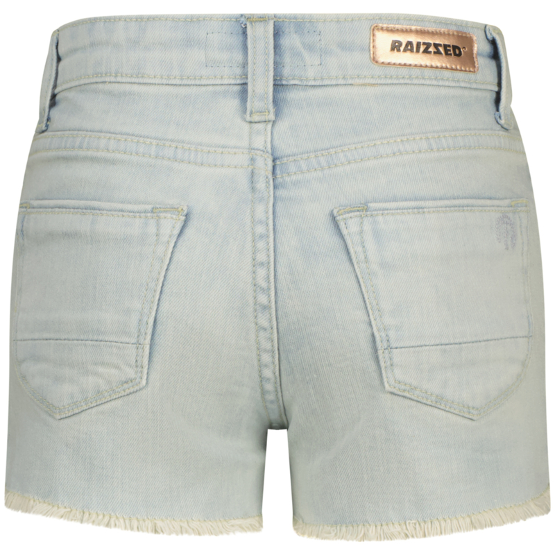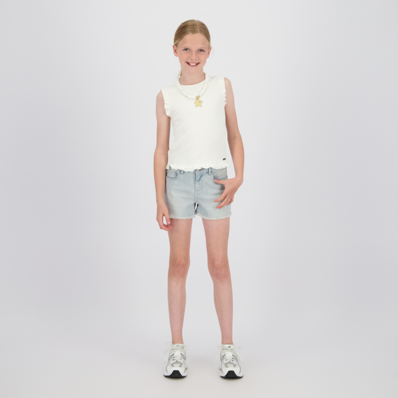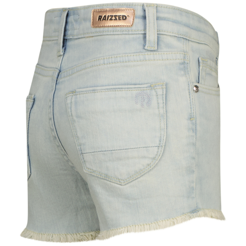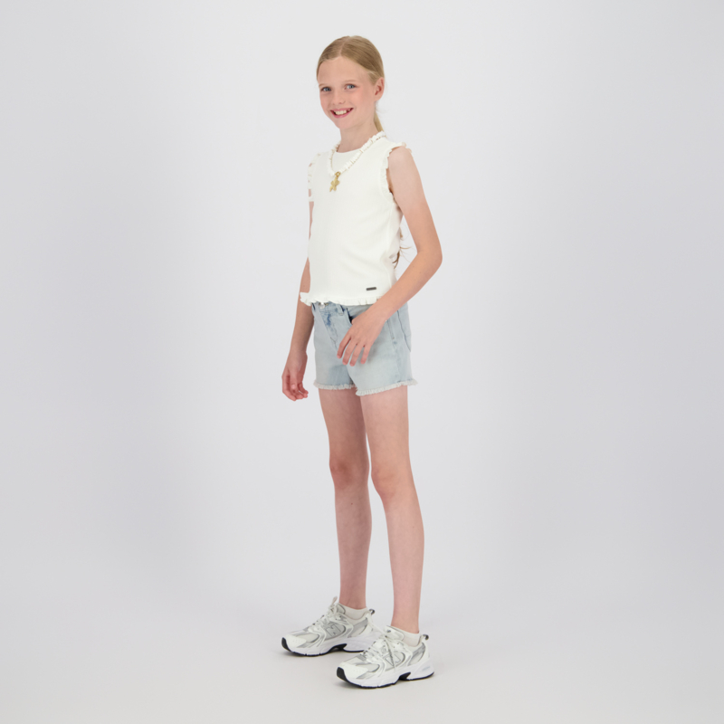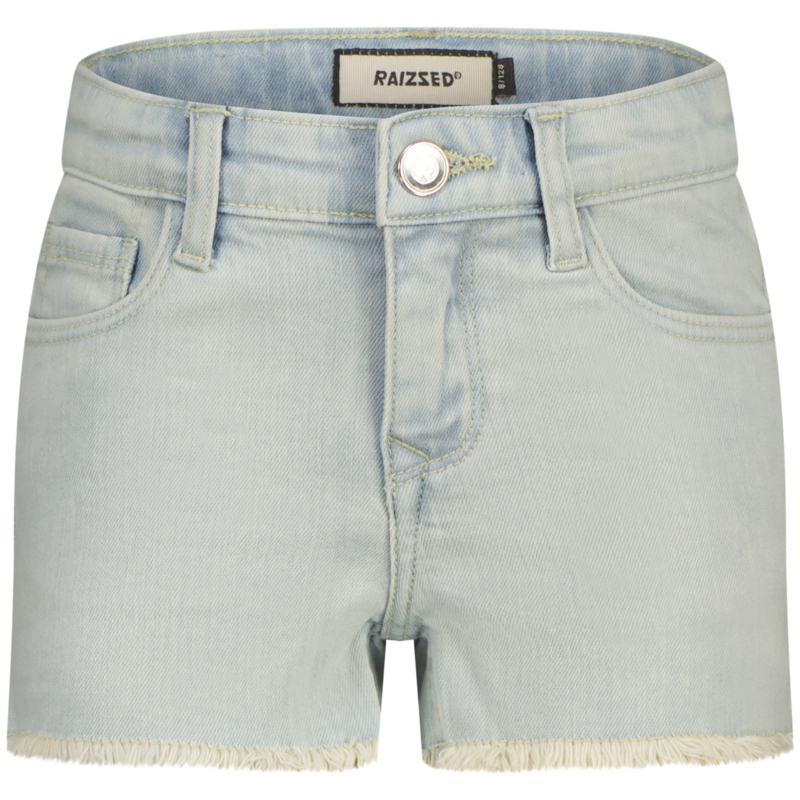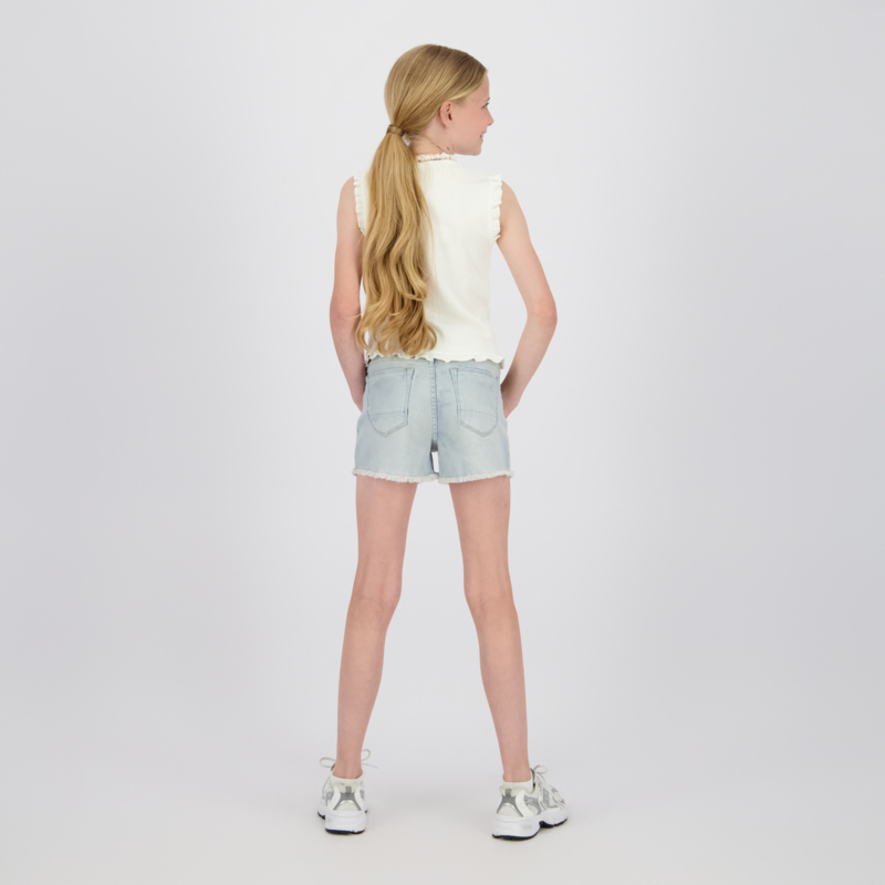 Stoere korte broek in een stretch jeans. In een lichte wassing met aan de binnenkant knoopsgaten elastiek.. Aan de onderkant een rafel randje.
