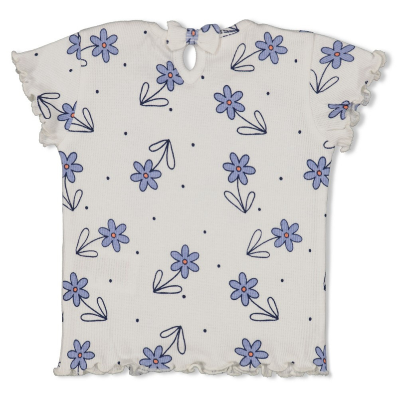 Ruimvallend shirt in het frisse wit met een jeans blauw bloemetje. Is ook leuk om te combineren met een bijpassend kort broekje.