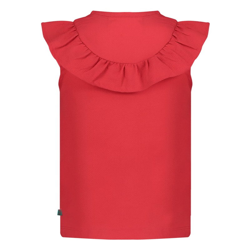 Fleurig rode blouse in een fijne rekbare stof. Met een grote ruche en houtkleurige knoopjes.