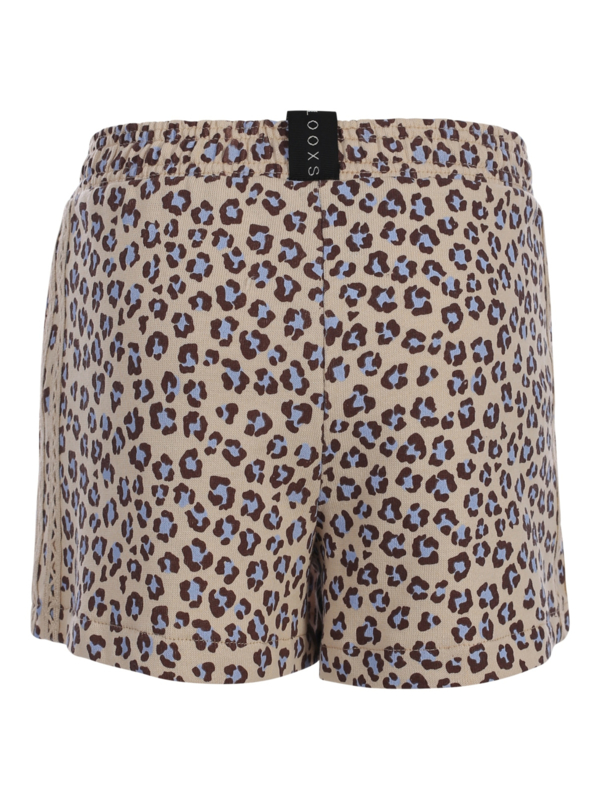Kort tricot broekje met een drierenprint in een zachte zandkleur met donkerbruin en lichtblauw gecombineerd. Aan de zijkant een kantenbies.