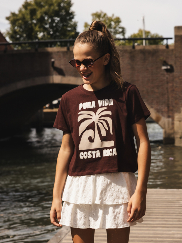 Ruimvallend shirt met een open gewerkte achterkant. Met een print op de voorkant. Is ook verkrijgbaar in het offwhite.