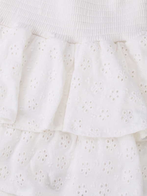Zomers strokenrok met een korte broek eronder. Bovenaan de boord een breed gedeelte elastiek. In een luchtig katoen met een broderie patroon.