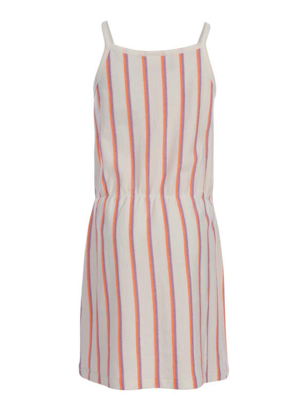 Tricot jurkje in een vrolijke frisse kleur met smalle bandjes. En een gekleurde print op de voorkant.