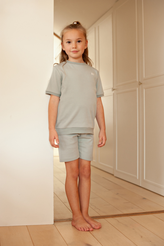 Wafelpyjama in een fijne tricot. Shirt en een korte broek . Is ook verkrijgbaar in een mauve kleur.