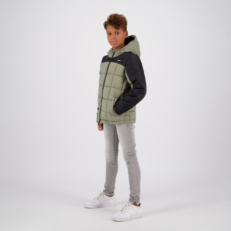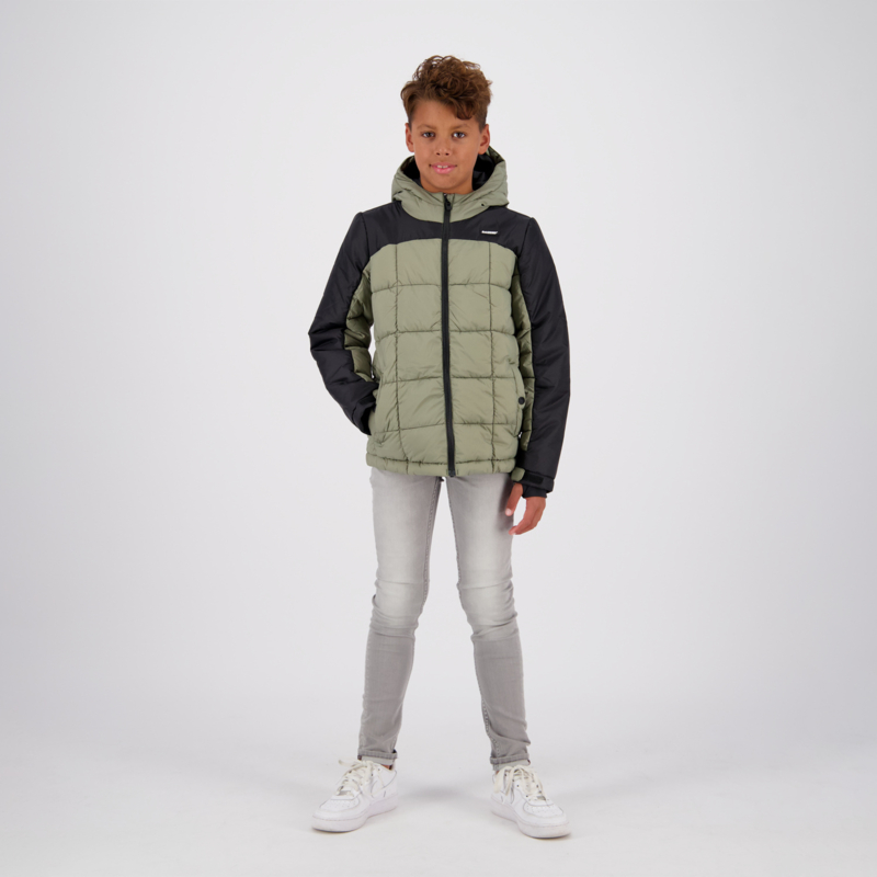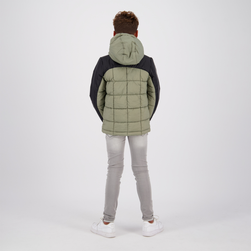 Artikelnummer: 0023jja OverzichtGewatteerde winterjas met onderaan de mouw windvangers in een licht grijs /groene kleur.