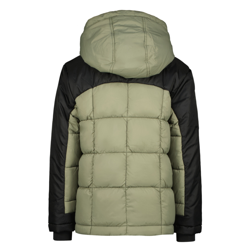 Gewatteerde winterjas met onderaan de mouw windvangers in een licht grijs /groene kleur.