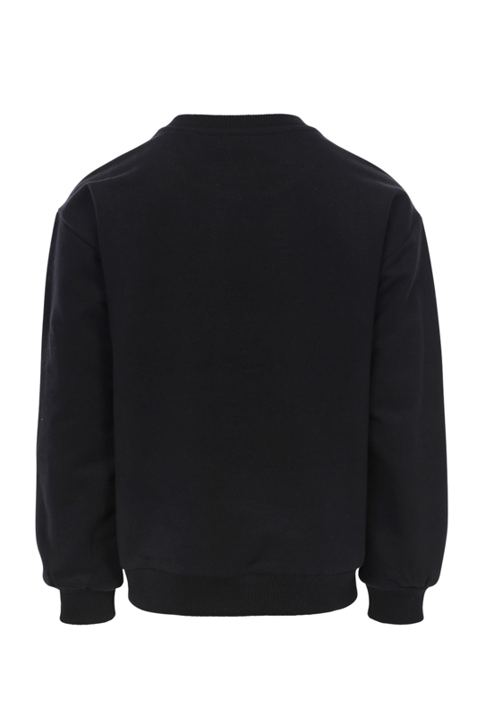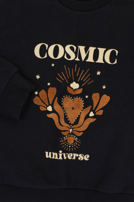 Ruimvallende sweater met een stoere print. En een pofmouw.