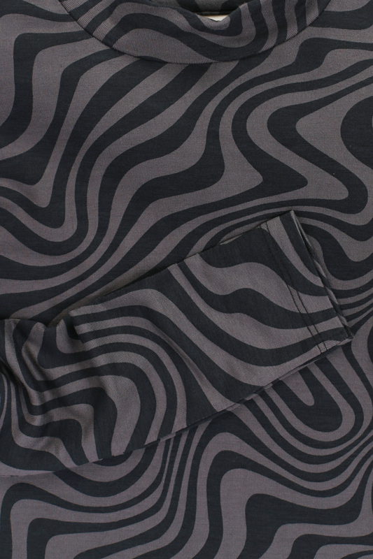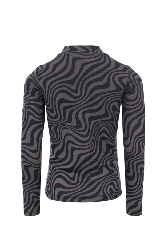 Aangesloten shirt met een golvende print. In de kleuren antraciet met zwart. Aan de hals een kort boordje.
